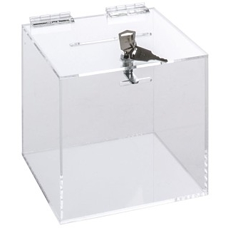 Clear Locking Ballot / Comment BoxModel: BB6Main Box Exterior Size: 6"W x 6"D x 6"H Sturdy Clear 1/8" (0.118" or 3mm) Acrylic with Smooth, Polished Edges Great for Ballots/Comments, Contest Entries, Business Card Drops, etc.